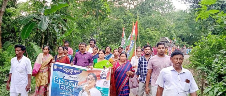আবার কেউ ভাবছেন, “নেতাদের মাথা খারাপ নাকি?” এই ঘটনায় শাসকদলের অস্বস্তি বাড়লেও, বাংলার রাজনীতিতে বিনোদন কিন্তু তুঙ্গে! এই স্লোগান উঠলো তৃণমূলের ২১ শে জুলাইয়ের শহীদ সভা সফলে আয়োজিত মিছিলে। এই মিছিলের আয়োজন হয় পূর্ব মেদিনীপুর জেলার পটাশপুর এক ব্লকের গোপালপুর গ্রাম পঞ্চায়েতের পাথরঘাটা এলাকায়। গোপালপুর অঞ্চল তৃণমূল কংগ্রেসের উদ্দোগে এই মিছিলের আয়োজন হয়। এই মিছিলে উপস্থিত ছিলেন পটাশপুর এক ব্লক তৃণমূল কংগ্রেসের সভাপতি বিনয় পট্টনায়ক, পঞ্চায়েত সমিতির সভাপতি নমিতা বেরা, গোপালপুর অঞ্চল তৃণমূল কংগ্রেসের সভাপতি মোহন মন্ডল ও গ্রাম পঞ্চায়েতের প্রধান সহ অন্যান্য নেতৃত্বরা।
