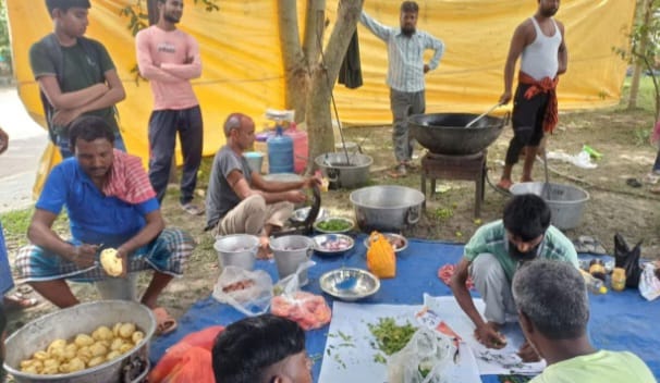 তাঁবু টাঙিয়ে এলাহি খাওয়া-দাওয়ার আয়োজন। বসিরহাট, হাড়োয়া আন্দুলিয়া, রোহান্ডা, মধ্যমগ্রাম থেকে আসা তৃণমূল কর্মী সমর্থকেরা ভুরি ভোজের আয়োজন করেছেন। গ্যাস ওভেন জ্বালিয়ে খাওয়া-দাওয়ার আয়োজন চললছে। কোথাও রান্না হচ্ছে ভাত, ডাল, আলু, পটল, চিংড়ি, মুরগির মাংস। আবার কোথাও রান্না হচ্ছে, ভাত ডাল আলু পটল চিংড়ি,মটন এলাহী আয়োজন।